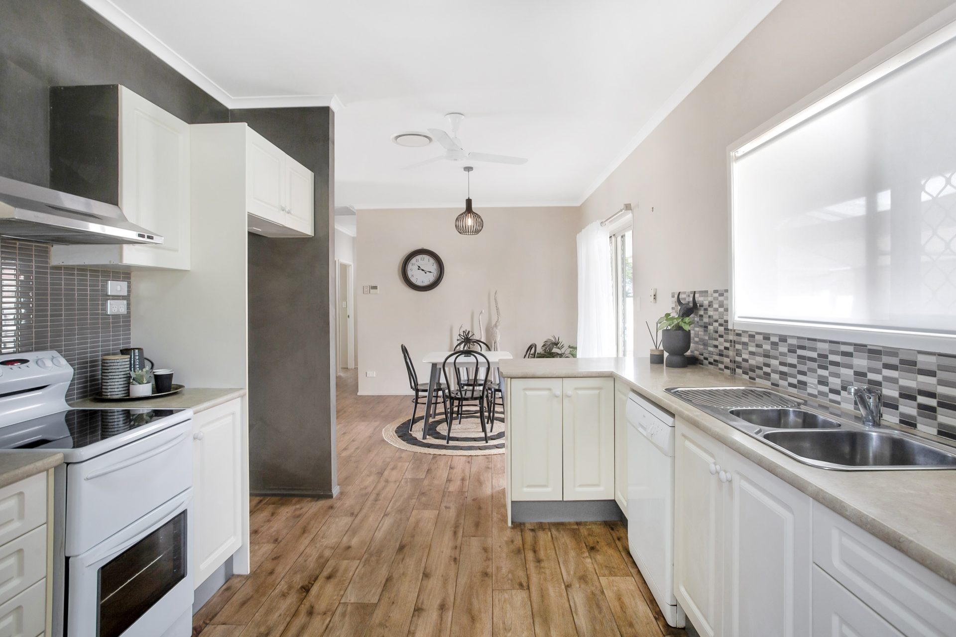 – galley style kitchen with Hamptons style cupboard profiles