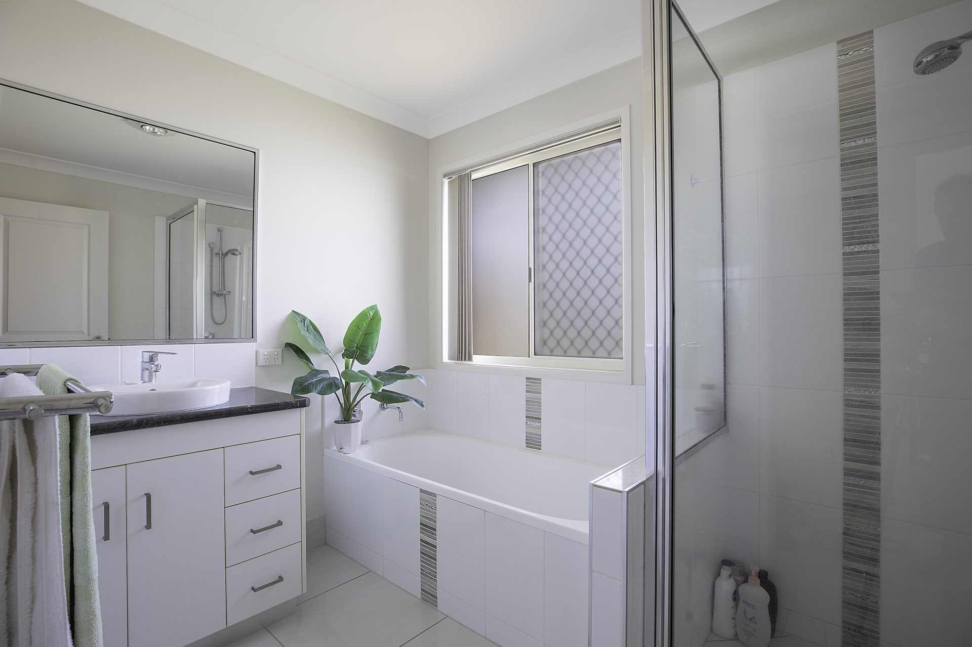 – family bathroom features a bathtub for the kids and a separate shower.