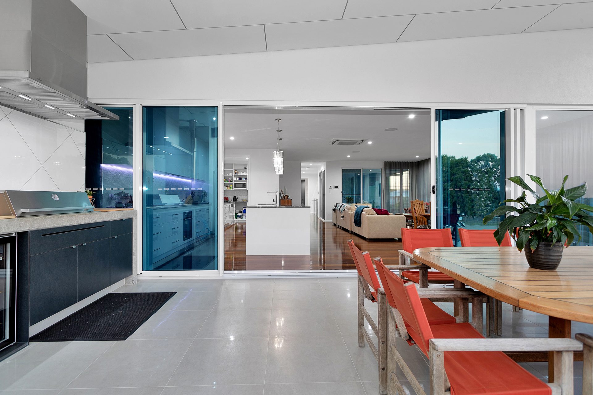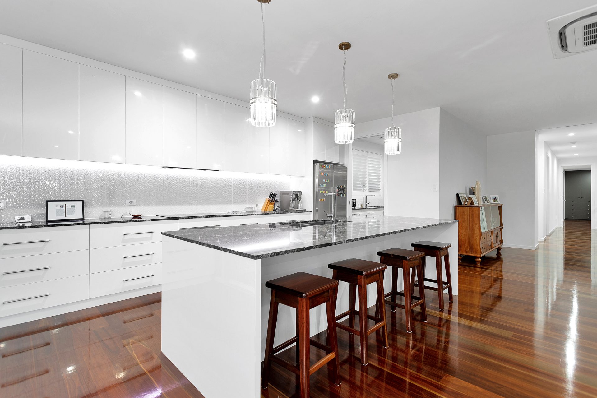 Downstairs unites the landscape with the open plan living and large family room, blending the outside with the indoors. Another three bedrooms are located downstairs as well as a huge bathroom and laundry.