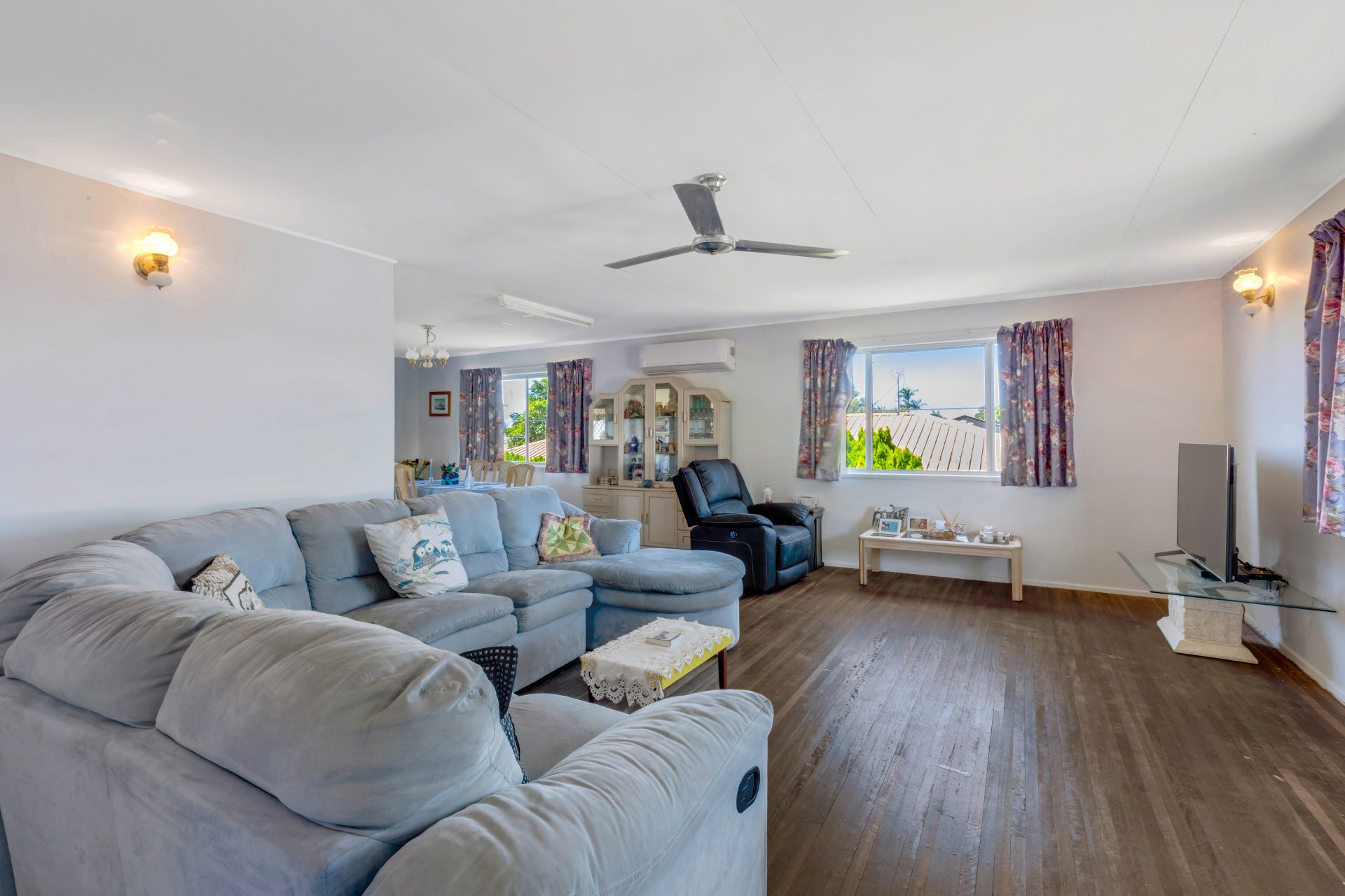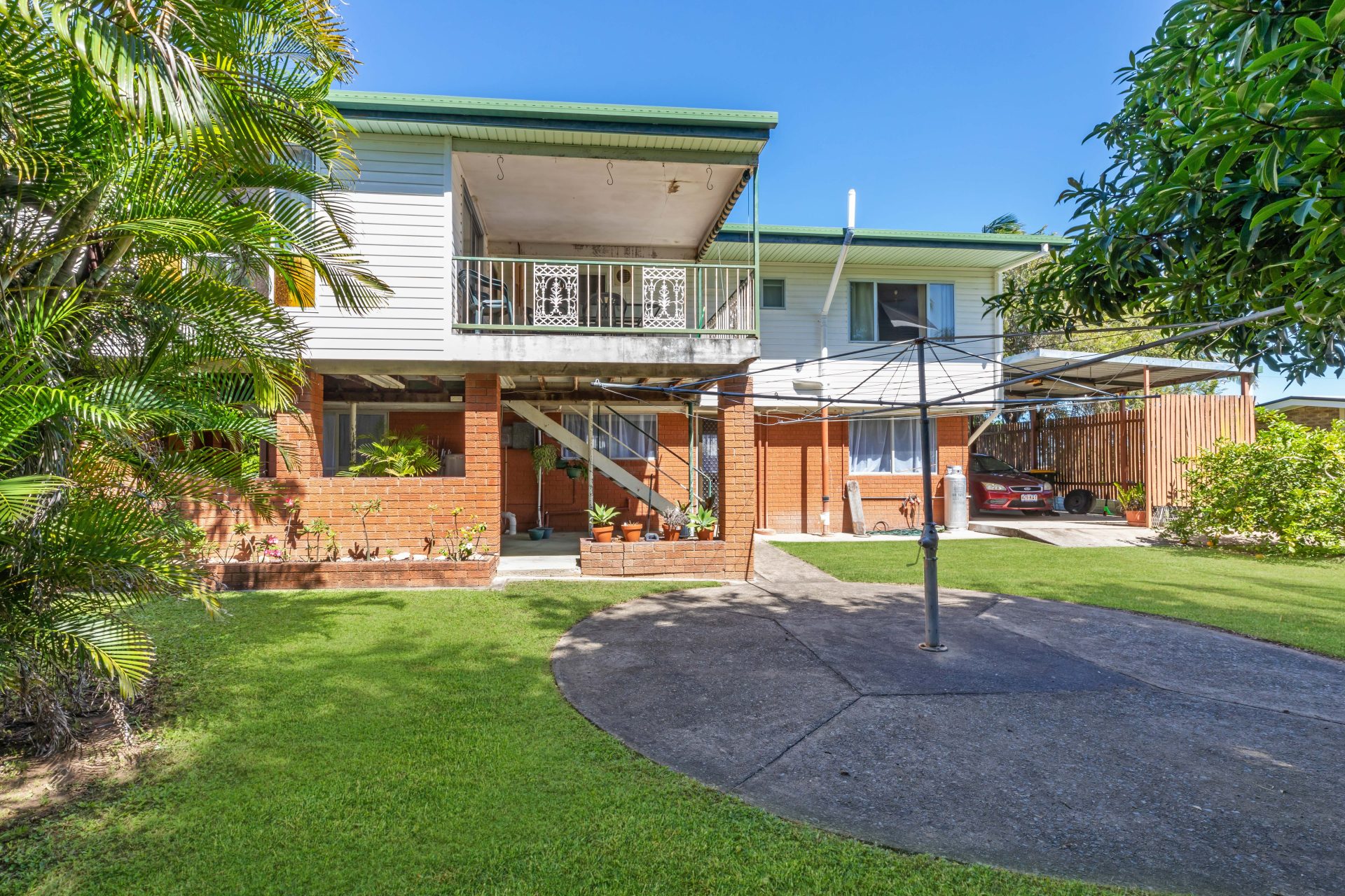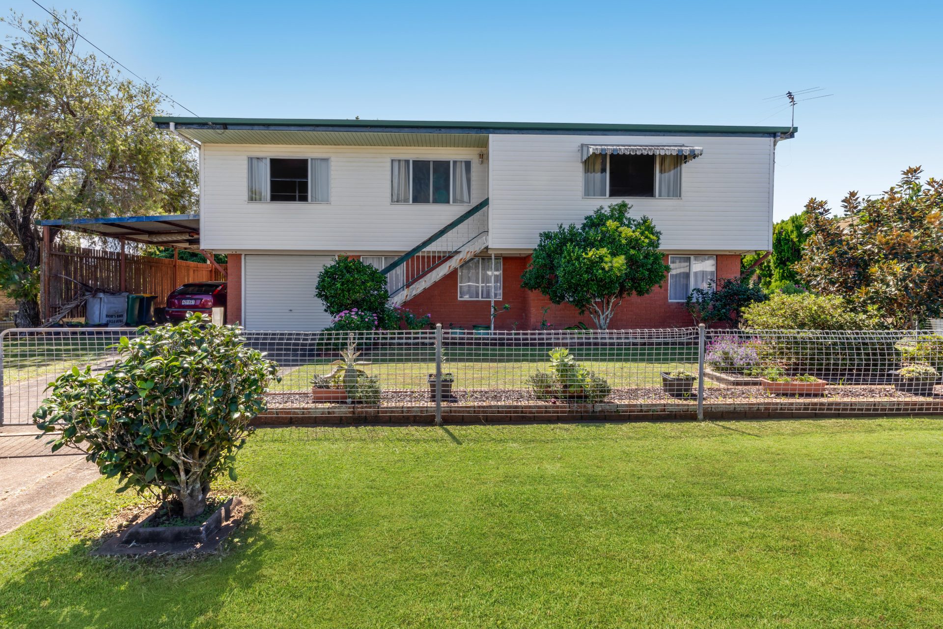 This lovely classic high set home is very spacious upstairs and down. The upstairs has three bedrooms and a large living area. The kitchen is spacious and leads out onto the back deck.