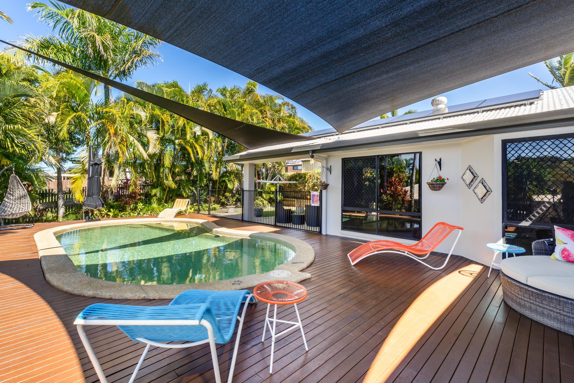 Solar panels to save on electricity bills / concrete salt water pool with lights