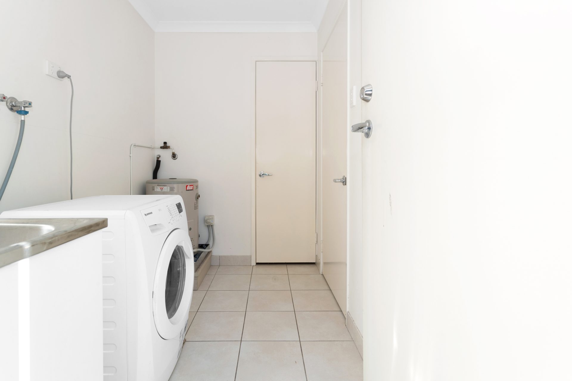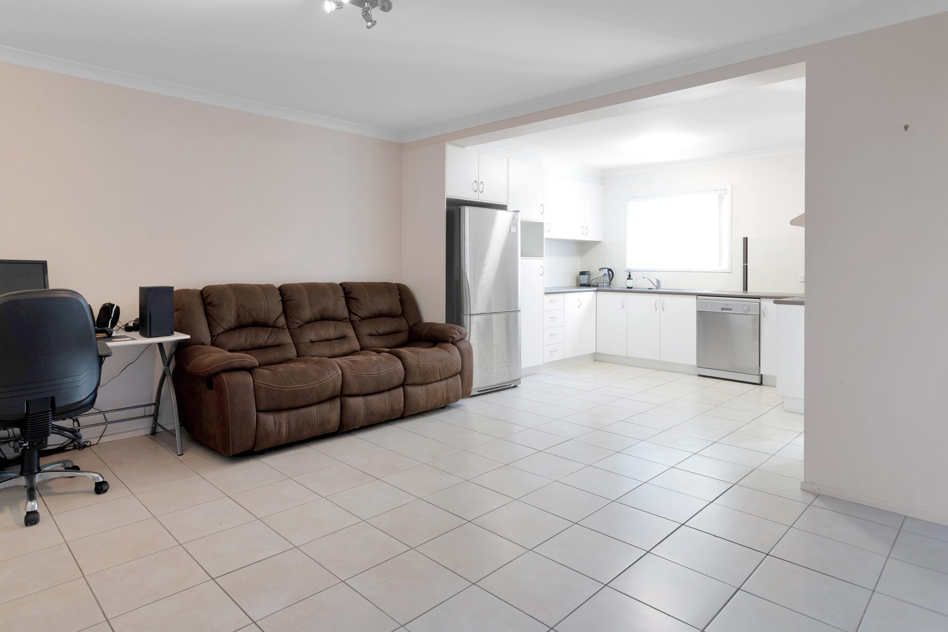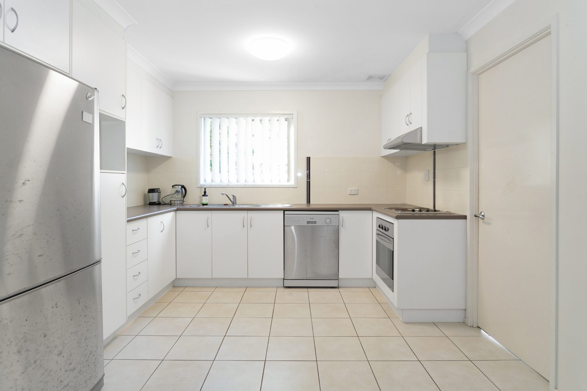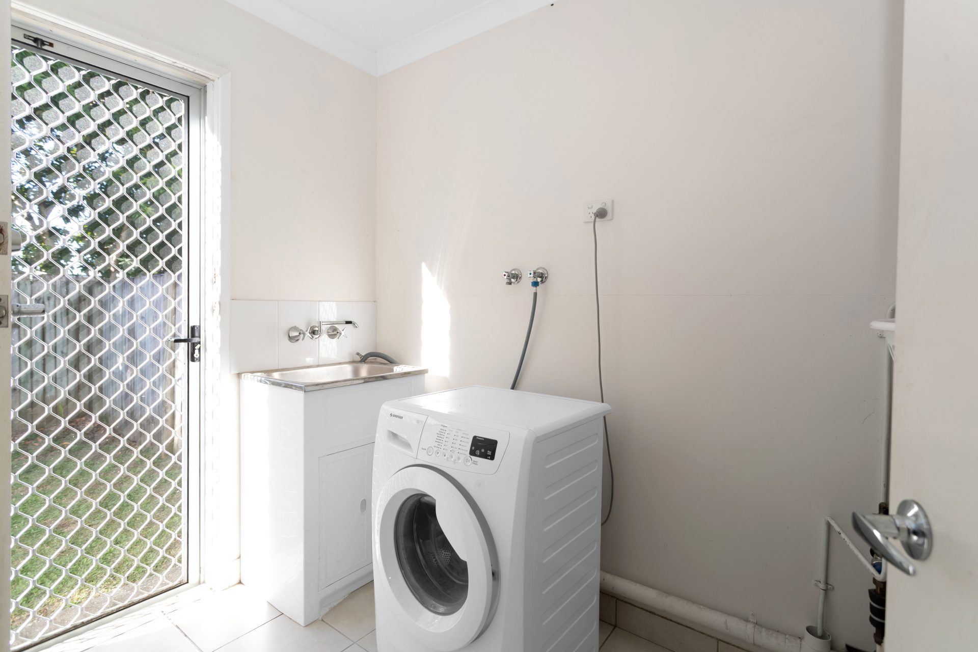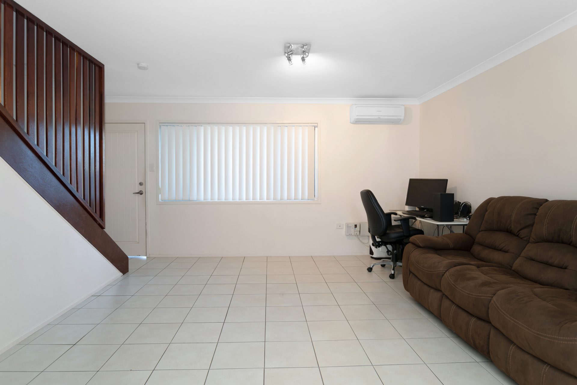 The downstairs area is fully tiled, includes a spacious open plan lounge/dining, air-conditioned. The kitchen is modern, also spacious, with a dishwasher. Underneath the steps there is extra storage. The laundry is separate, of good size, and will fit a storage cupboard as well. The back small courtyard is fully fenced, has a clothes hoist.