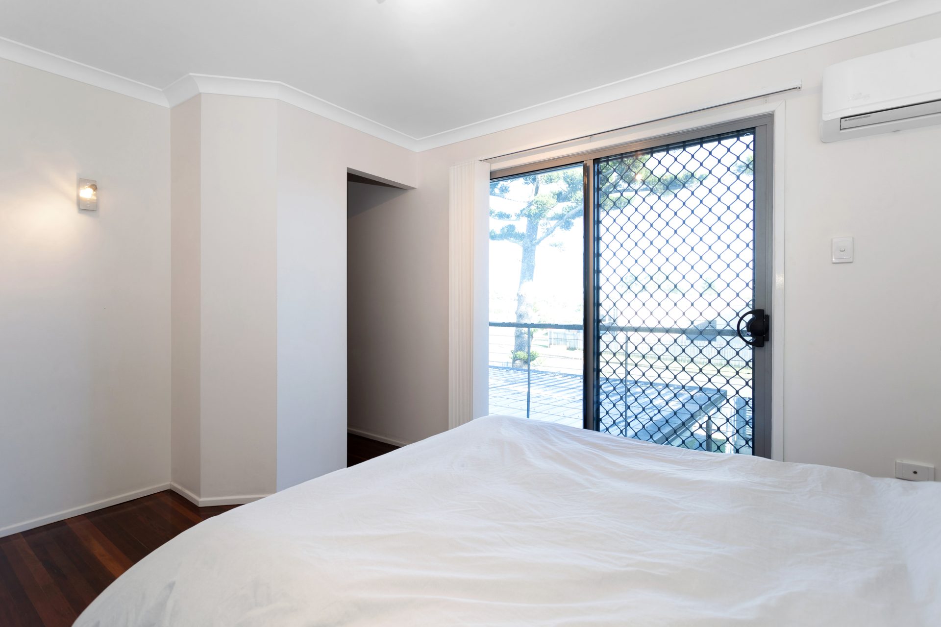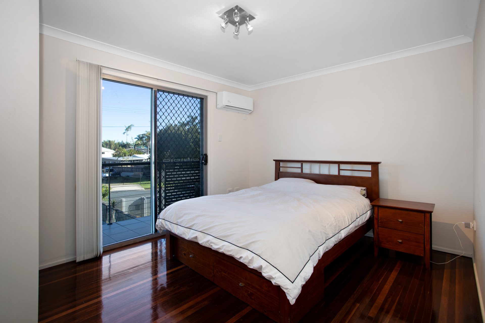 Polished timber stairs lead up to two generous size bedrooms which also have polished timber floors. The master is air-conditioned with a walk-in-robe and private balcony. Second bedroom has a built-in-robe and fan. Modern bathroom with shower and WC.