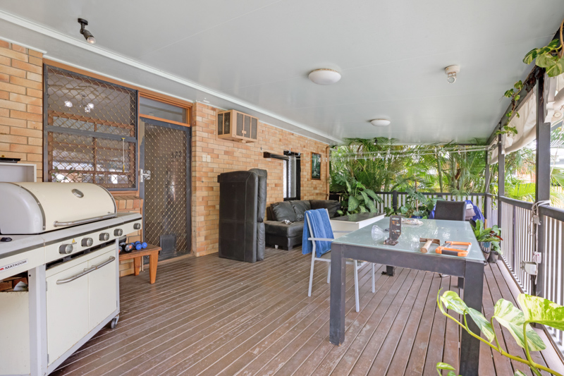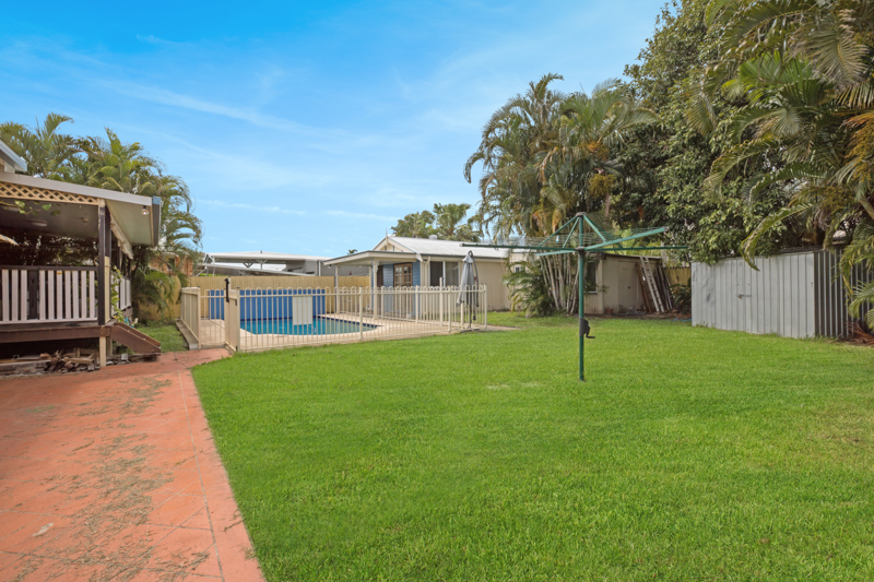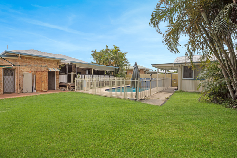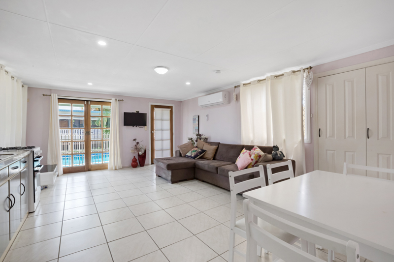 The home offers three bedrooms, with plenty of room for a fourth bedroom, polished floors, modern kitchen, multiple living areas, internal laundry, and an outdoor covered timber deck overlooking the pool.