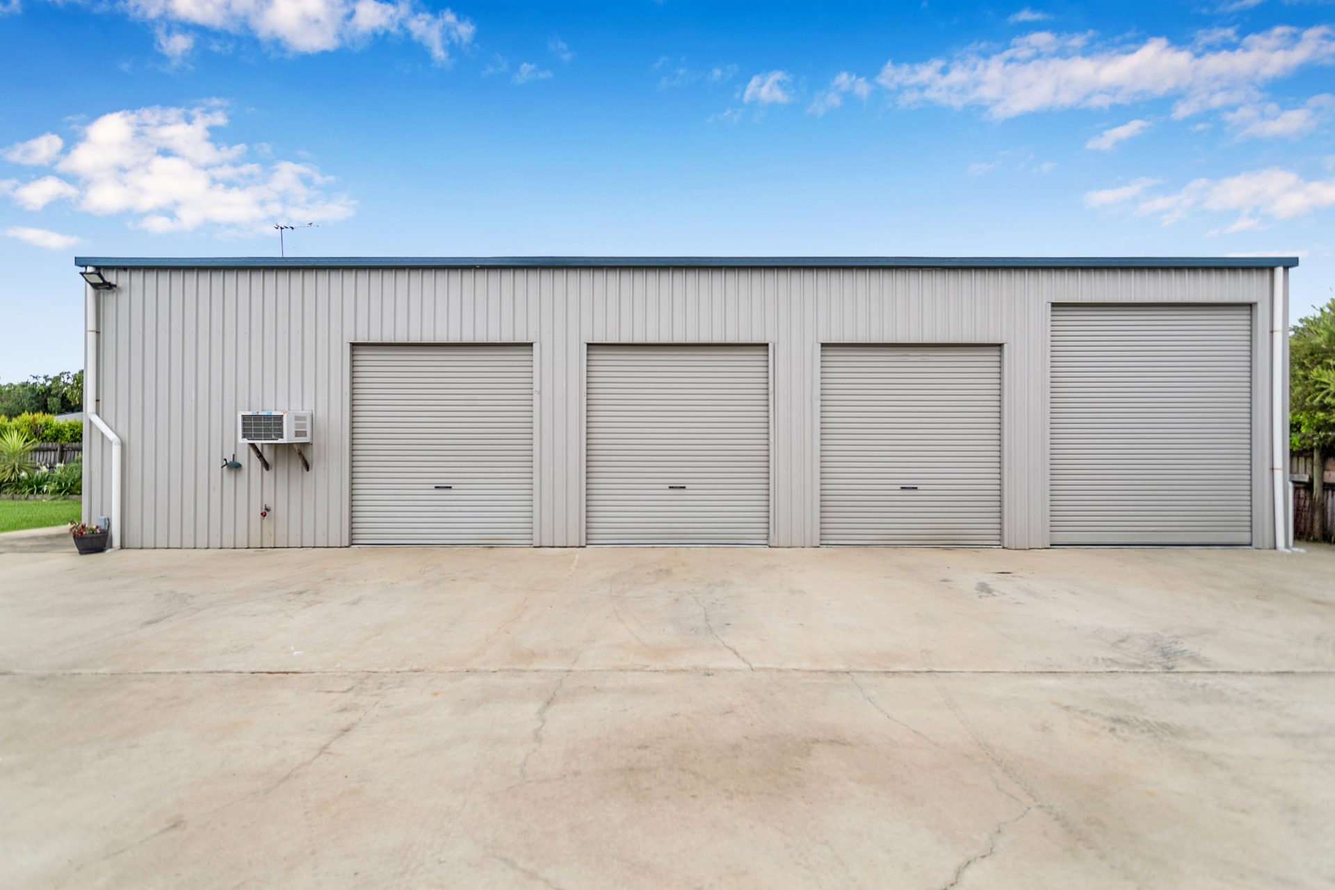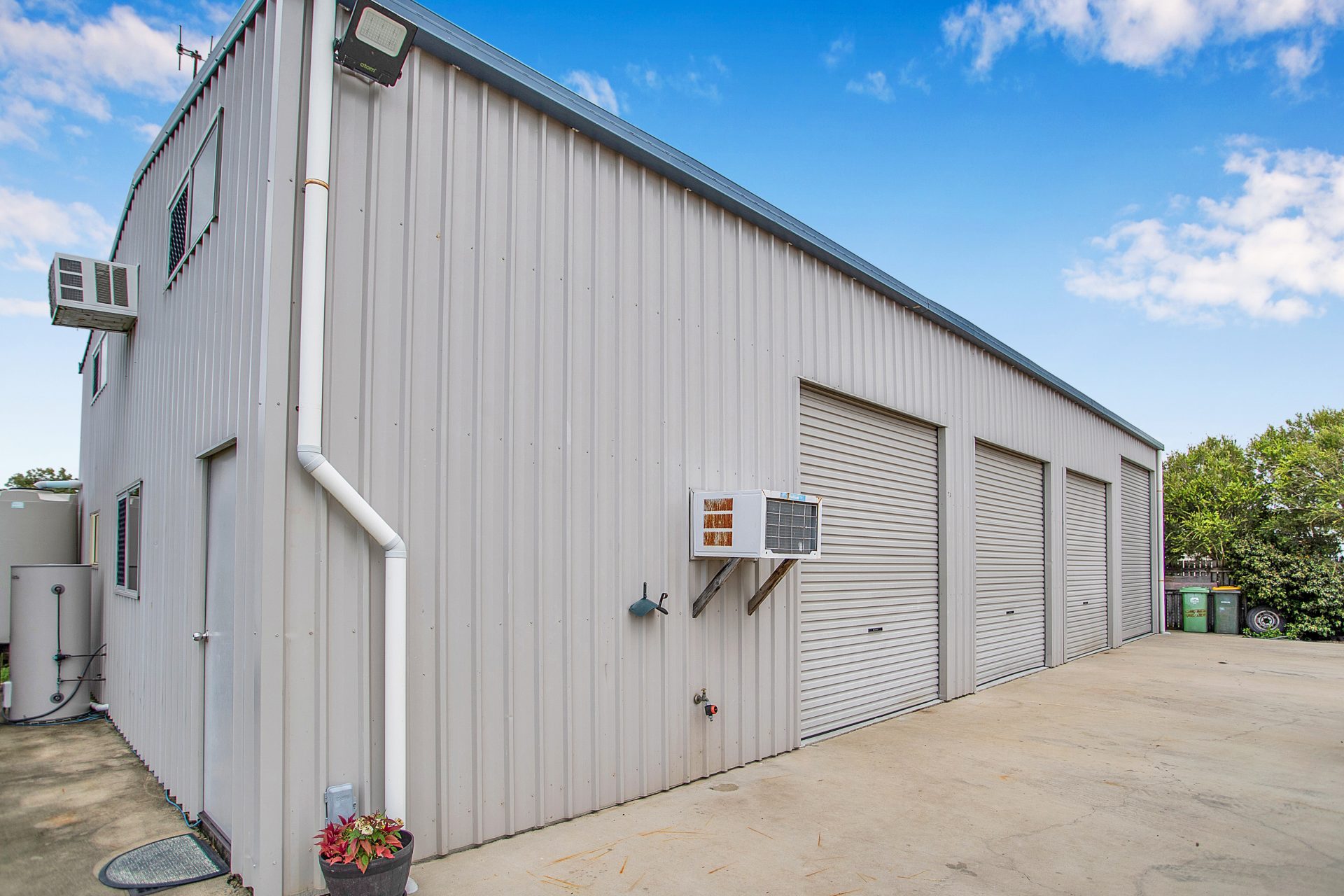 If you are after a large shed, this is the one for you! High profile, with 4 oversized bays, the last being big enough to house the boat or caravan. Remote control on one of the doors. Workshop area with kitchen and bathroom + staircase up to loft area for even more storage. Fully powered and insulated. Extra-wide side access + concrete driveway to the road