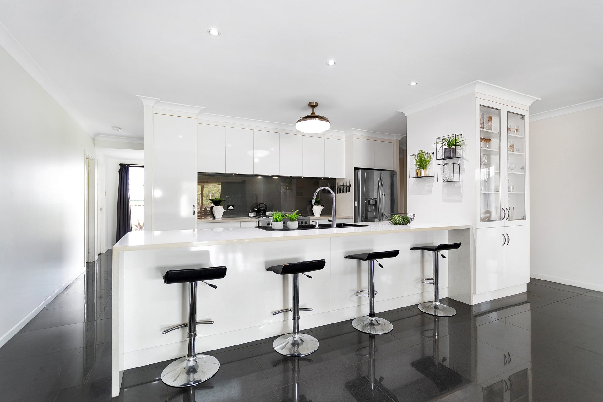 Spacious open plan family and dining with a raked ceiling in the living area creating a light and airy ambiance. The beautiful island-style kitchen overlooks the family room and features plenty of storage and bench space, stainless steel appliances including 900mm gas cooktop, dishwasher, and provision for wine fridge + work station to house all the appliances. Massive walk-in pantry.