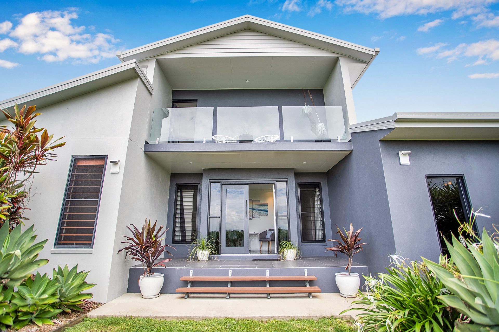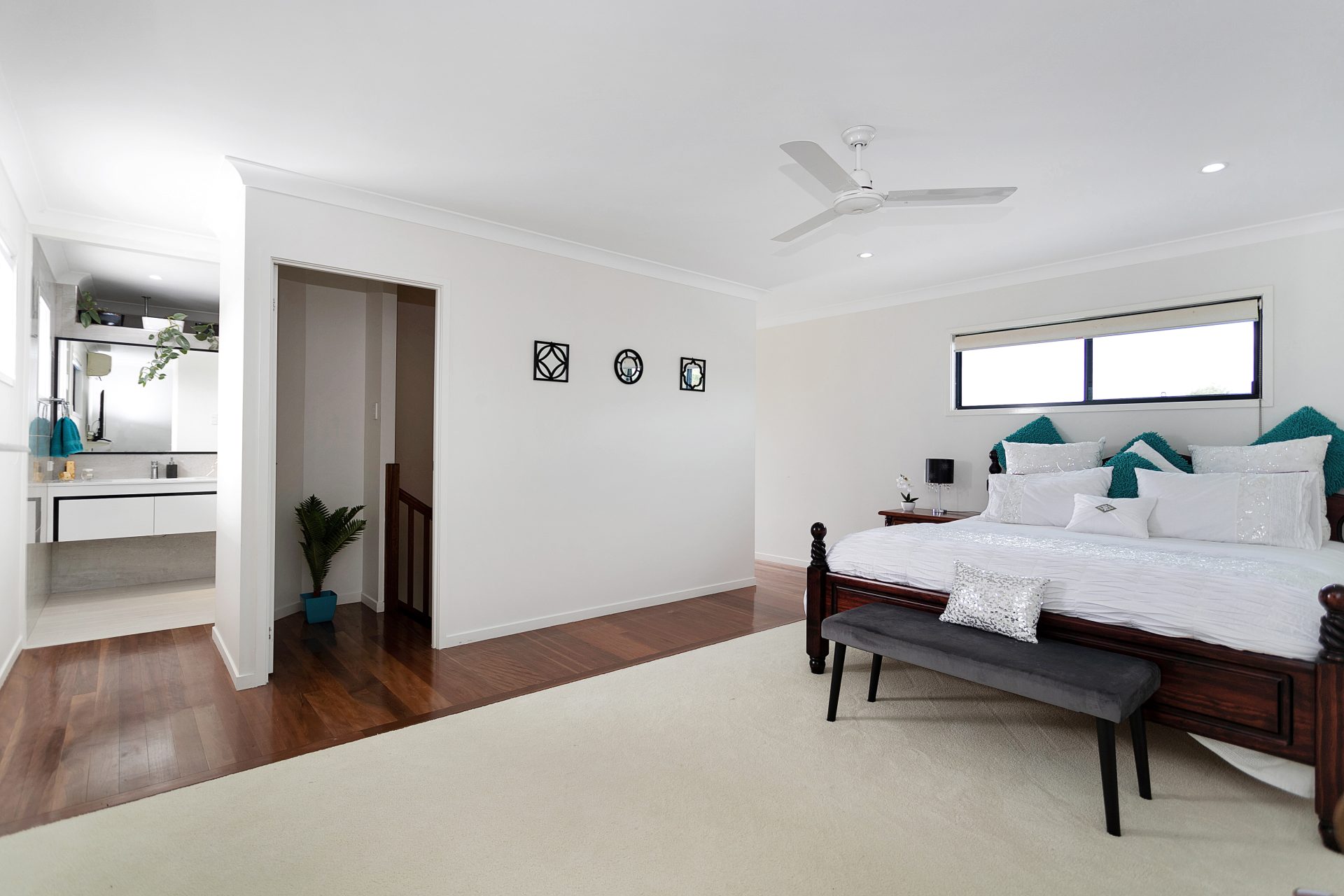 The beautiful timber stairs lead up to the parent’s retreat. Massive bedroom with modern ensuite featuring floor to ceiling tiling, gorgeous vanity, and massive double shower. Walk-in robe + your own balcony to unwind and enjoy overlooking the rural setting.