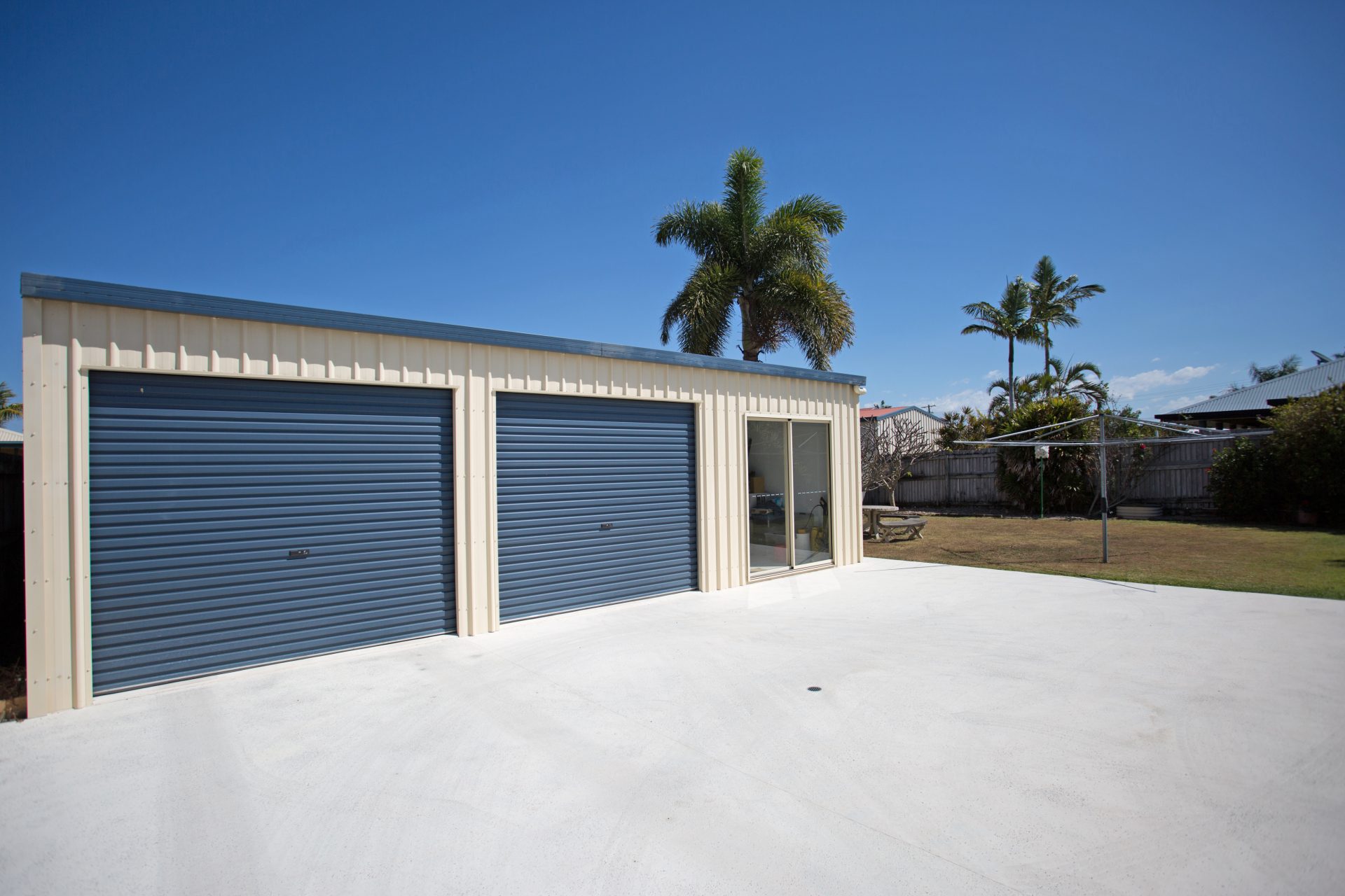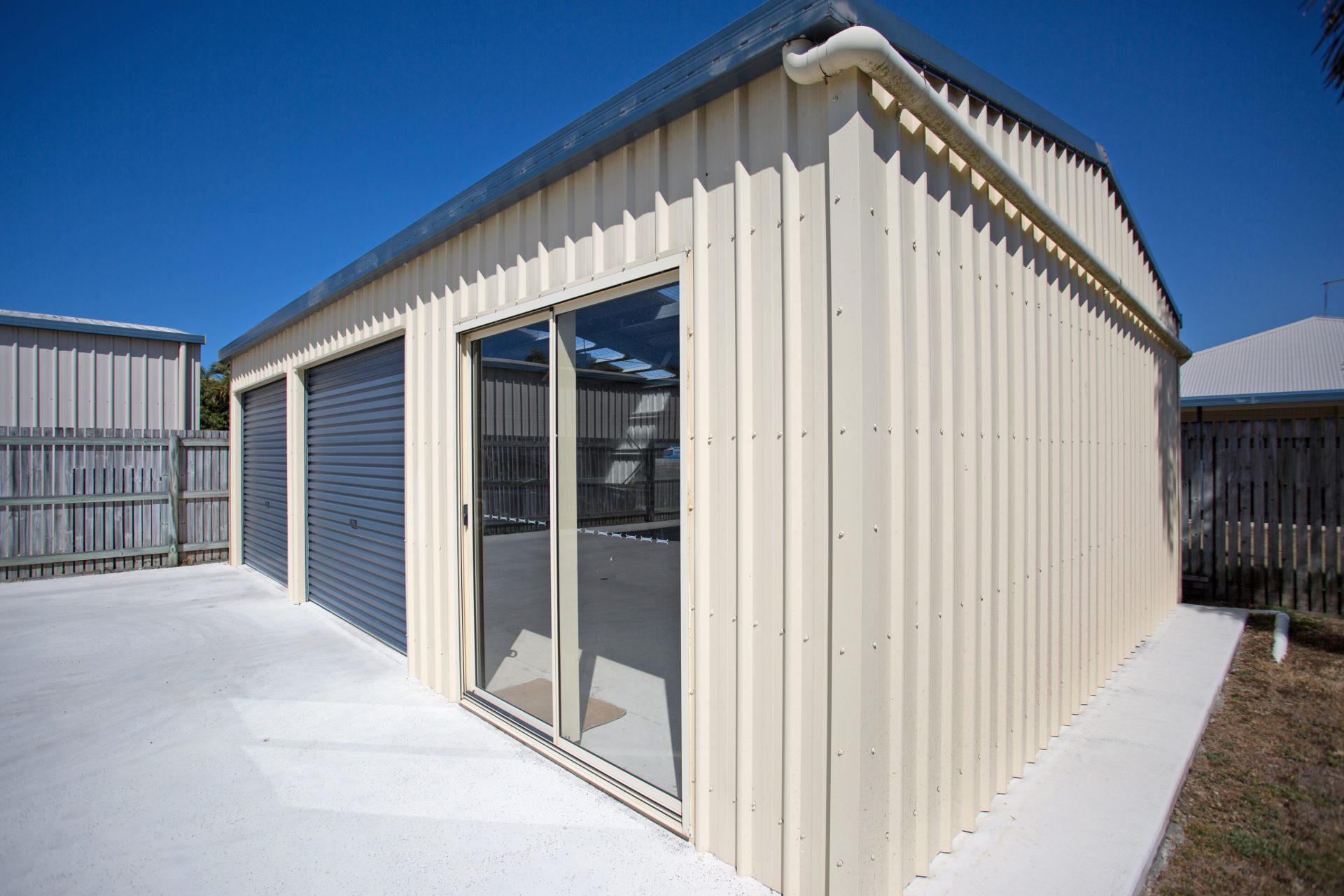 2 bay colour-bond shed + workshop with side access and still enough room to fit a pool.