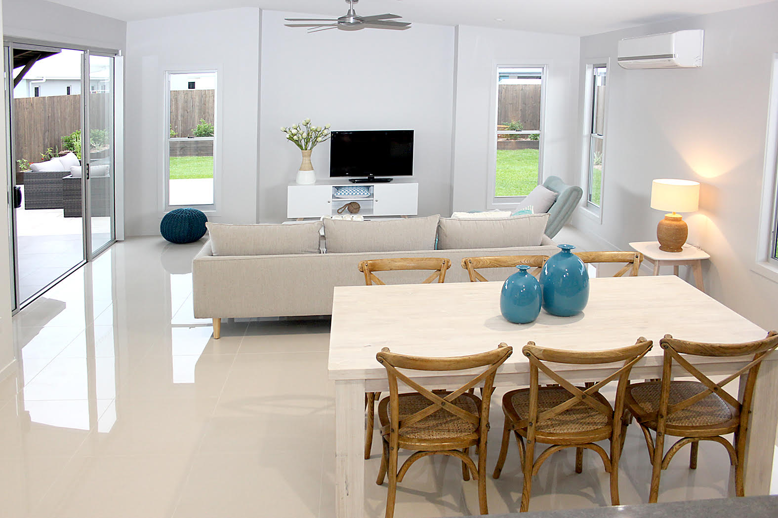 Open plan air conditioned, porcelain tiled main living area and raked ceiling