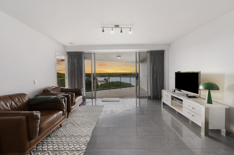 Positioned on Level 6 (the second-highest floor) of the Fusion Apartments, this 3-bedroom, 2-bathroom unit gives you front-row seats to some of the best views in Mackay. From the main balcony, you can see the Pioneer River stretch out in front of you, the harbour to the side, and the mountains rolling in the distance. It’s the kind of view that hits different, morning or night.