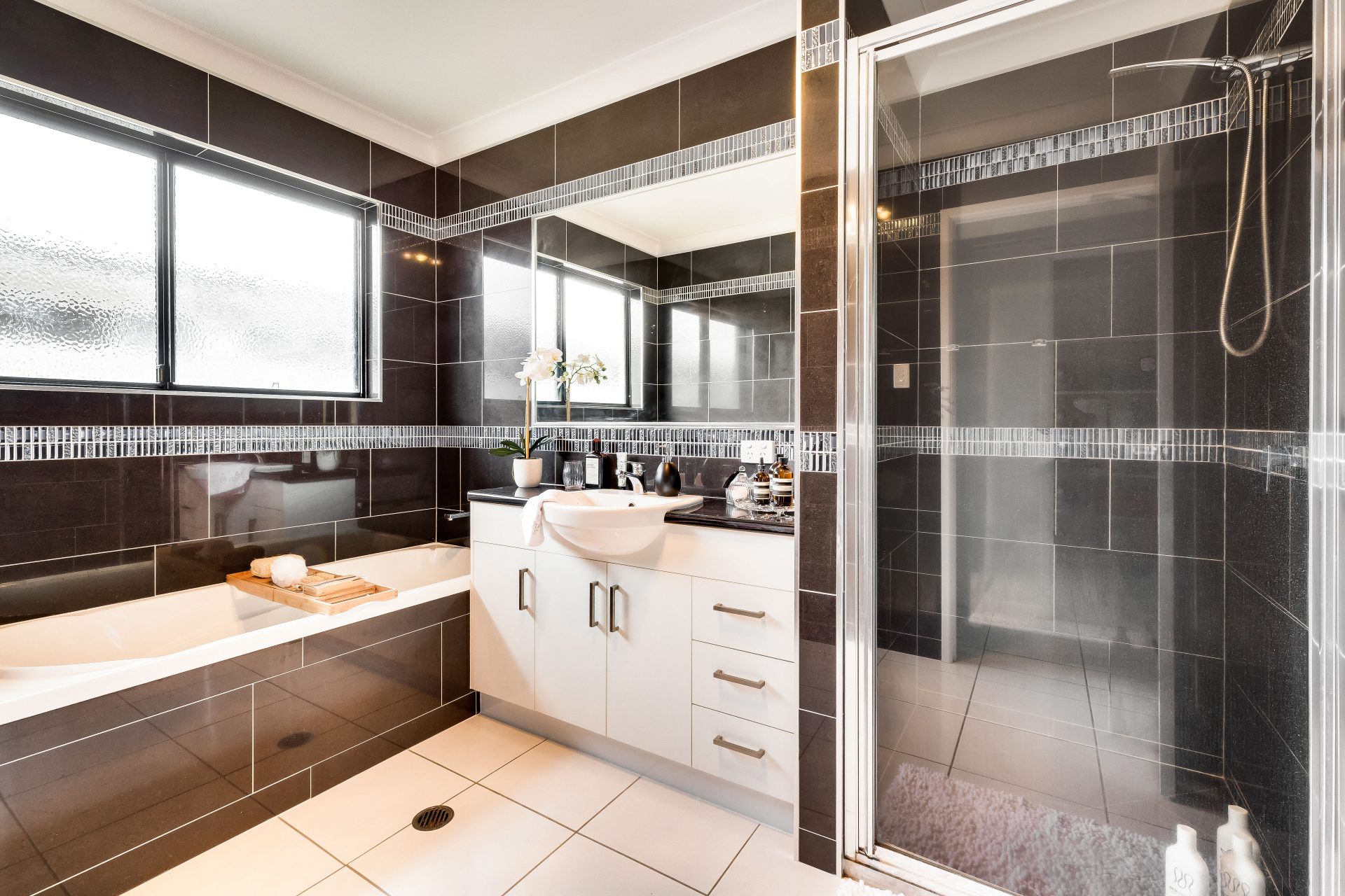 Contemporary bathroom with wall high tiles
