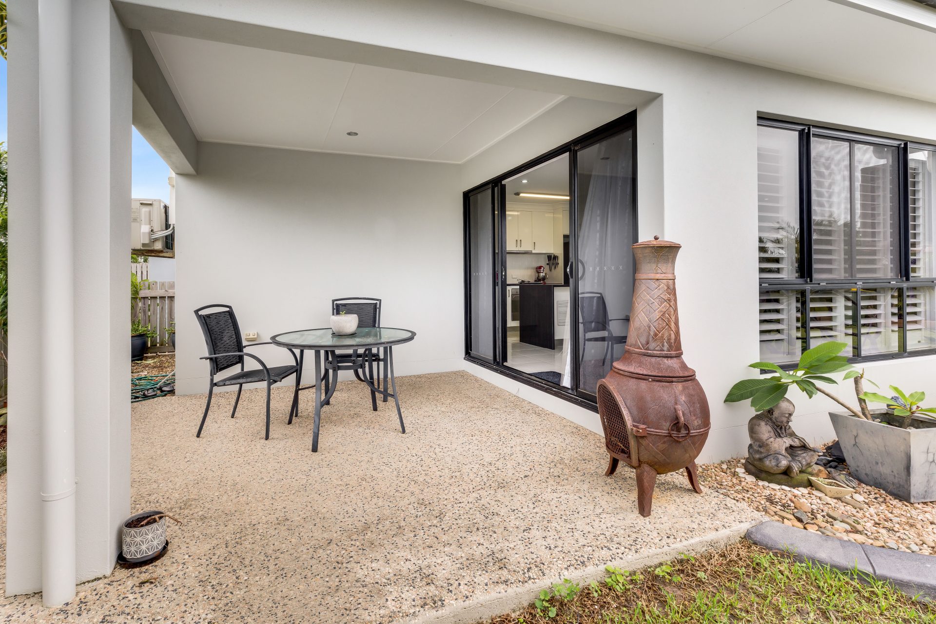 Covered outdoor entertainment area and easy access to the shed